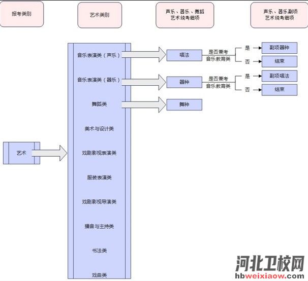 根據(jù)河北省實(shí)際,高考報(bào)名時(shí)“報(bào)考類別”選擇“藝術(shù)”的考生須從音樂表演類(聲樂)、音樂表演類(器樂)、舞蹈類、美術(shù)與設(shè)計(jì)類、戲劇影視表演類、服裝表演類、戲劇影視導(dǎo)演類、播音與主持類、書法類、戲曲類等10個(gè)“藝術(shù)類別”中選擇1類報(bào)考,不可兼報(bào)。報(bào)考音樂表演類(聲樂)的考生,可選擇“兼考音樂教育類(聲樂主項(xiàng))”,同時(shí)獲得音樂教育類(聲樂主項(xiàng))報(bào)考資格;報(bào)考音樂表演類(器樂)的考生,可選擇“兼考音樂教育類(器樂主項(xiàng))”,同時(shí)獲得音樂教育類(器樂主項(xiàng))報(bào)考資格。